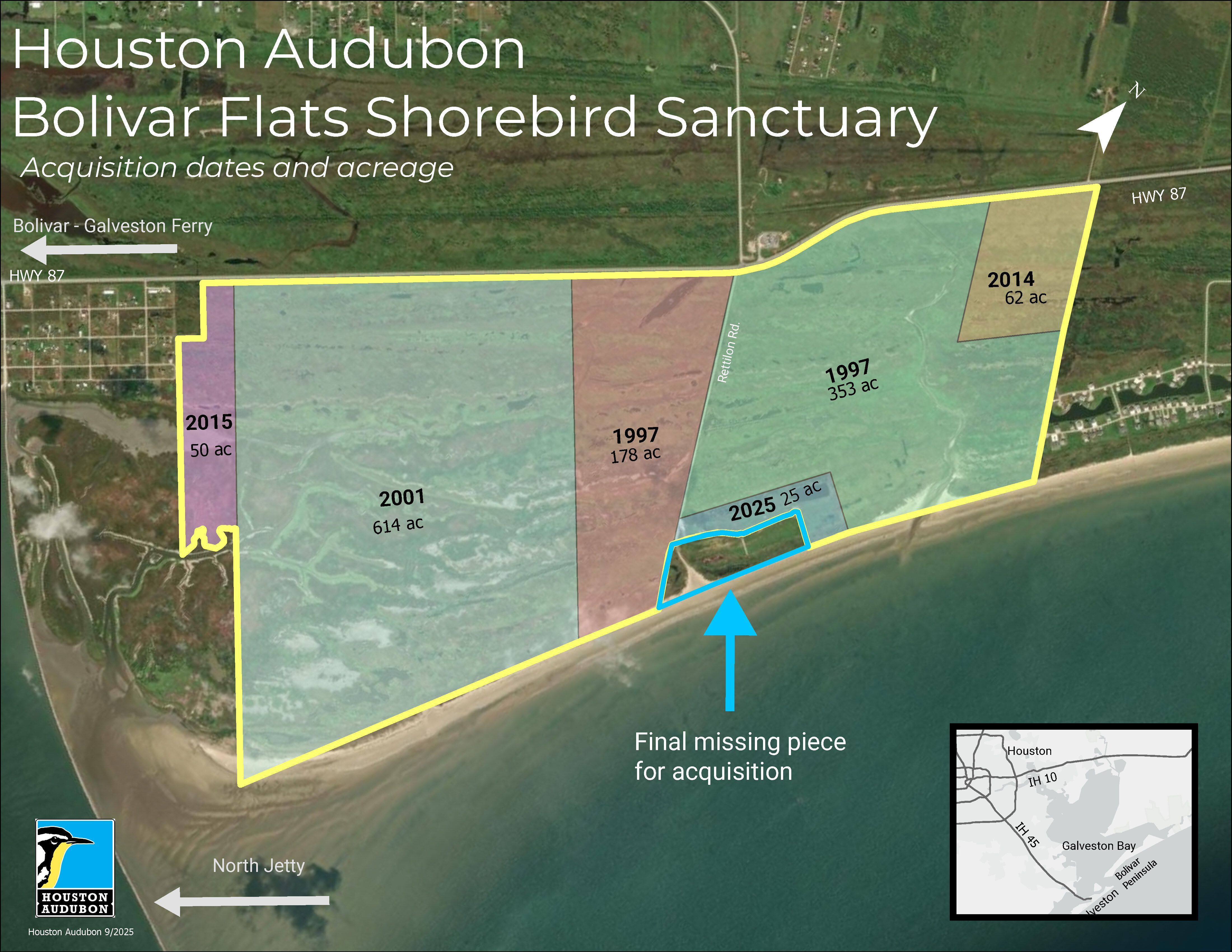 In the 1980s, Houston Audubon first took action to protect Bolivar Flats, located across the Galveston Ferry on Bolivar Peninsula. Since that time, we have secured 1,240 acres of this critical habitat. The last missing piece is under a tight final purchase deadline as $3 million is needed to prevent the already planned and platted development.